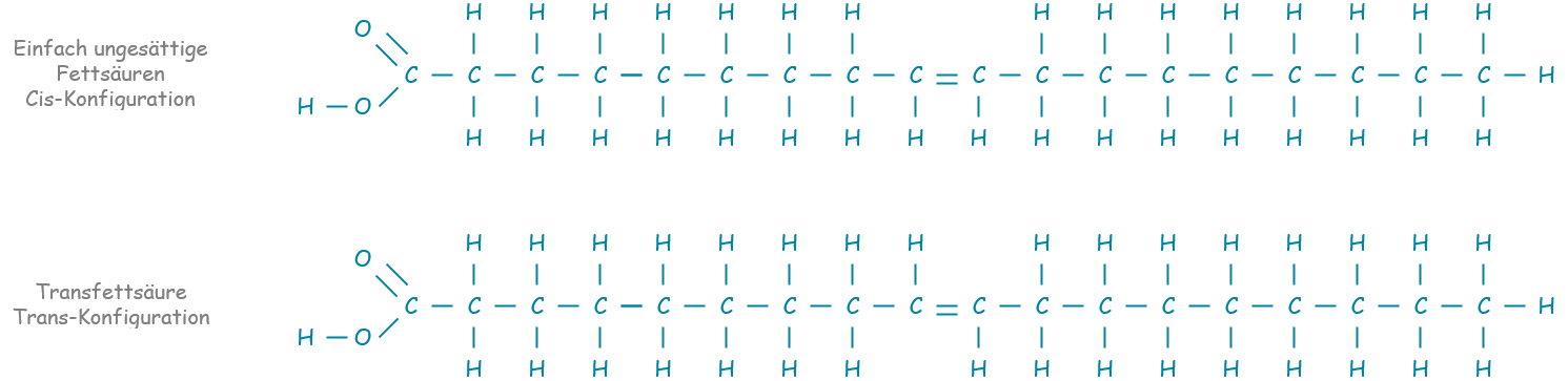 Die bisher betrachteten ungesättigten Fettsäuren haben durch ihre Doppelbindung eine cis-Konfiguration erhalten. Bei Transfettsäuren entsteht durch die Doppelbindung eine Trans-Konfiguration, wodurch sie eben wie der Name sagt zu einer Transfettsäure werden. Diese Transfettsäuren befinden sich z.B. bis zu 4% des Fettgehaltes in Milchprodukten, da sie bei Wiederkäuern im Magen durch Bakterien entstehen. Diese natürlich vorkommenden Fette sind für den Körper allerdings nicht schädlich.